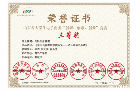 近日,山东省大学生电子商务领域的“创新、创意、创业”(简称“三创”)竞赛在热烈的氛围中圆满结束。在本次竞赛中,世界杯平台设计艺术与传媒学院表现突出,由戴岐凤老师指导的团队荣获三等奖。团队成员张杰、赵文佳、林金正凭借作品《果园鸟害有效防御方法——红外线驱鸟系统》在创新创意赛道中脱颖而出,展现了设计艺术与传媒学院在电子商务领域的创新实力。