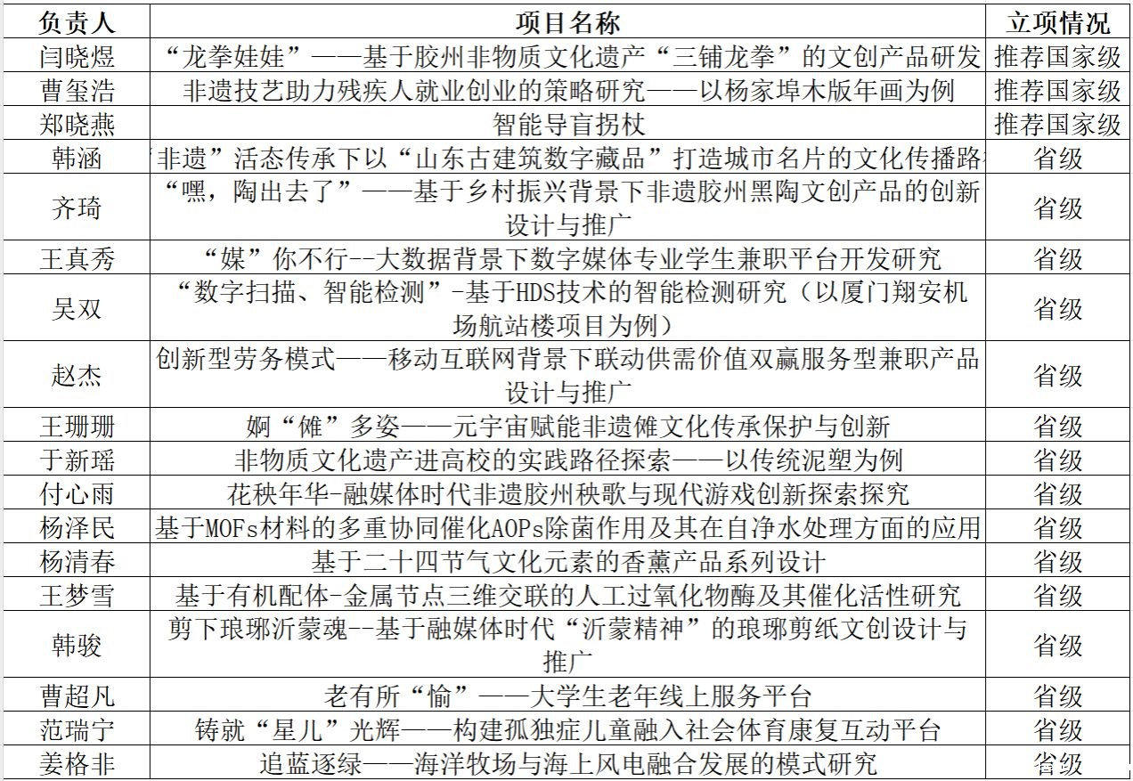 近日,山东省教育厅对2024年省级大学生创新创业训练计划项目拟立项名单进行公示,我校共18个项目拟省级立项,其中3个项目拟推荐国家级立项。